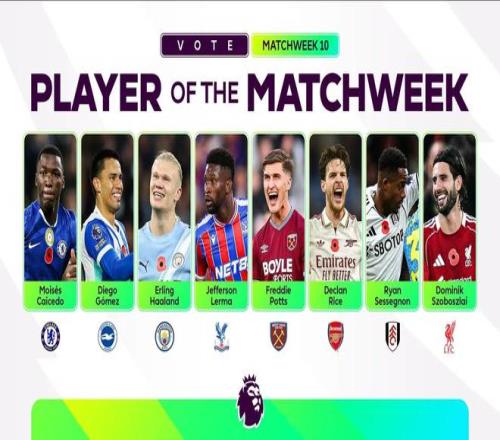北京时间11月4日,英超官方公布了第10轮比赛的最佳球员候选名单,其中赖斯、哈兰德、索博斯洛伊、凯塞多等人在列。
