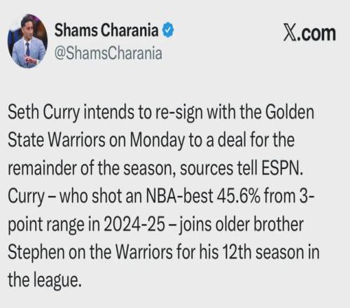 爆料王Shams报道:赛斯-库里,将与勇士签约至本赛季结束。