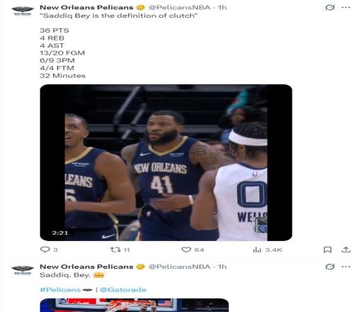 萨迪克-贝32分钟,拿到36分4篮板4助攻1抢断(末节19分);鹈鹕队末节打出40-26的浪潮多亏了萨迪克-贝。